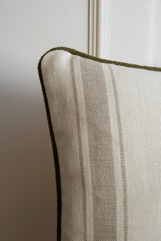 Shadowed Linen Stripe Cushion - Deep Olive Piping