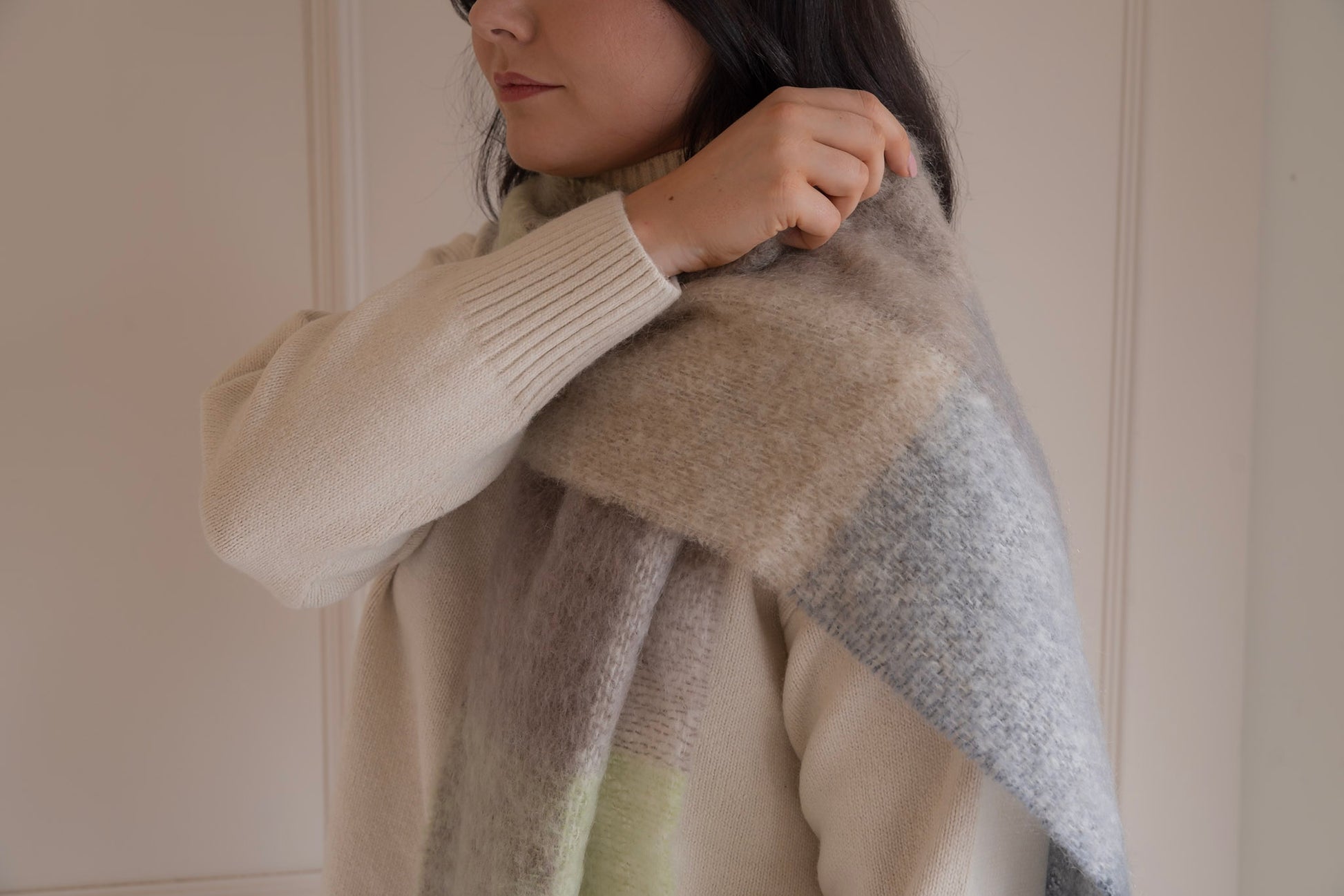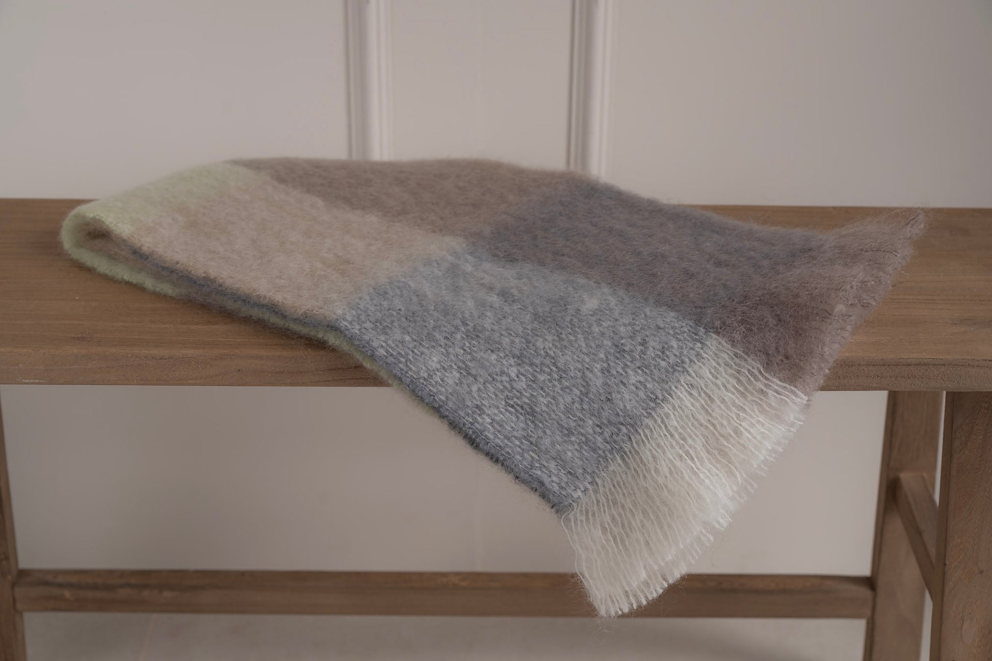Wrap up in natural fibres by using the warmth of Mohair. A gorgeous mix of colours in a classic checked pattern. Perfect for draping over your Autumn/Winter wardrobe.